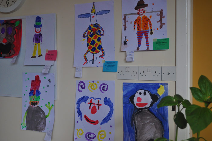 An array of painted clowns by Primary pupils: