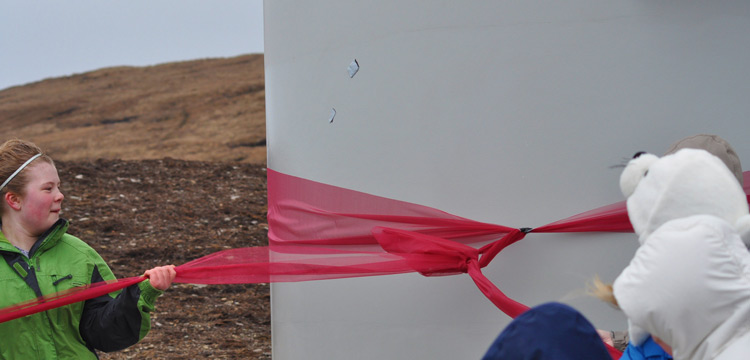 Pupils at Rousay Primary School joined together to pull the ribbon around the Community Wind Turbine on Kingarly Hill today, declaring the turbine officially 'open'.